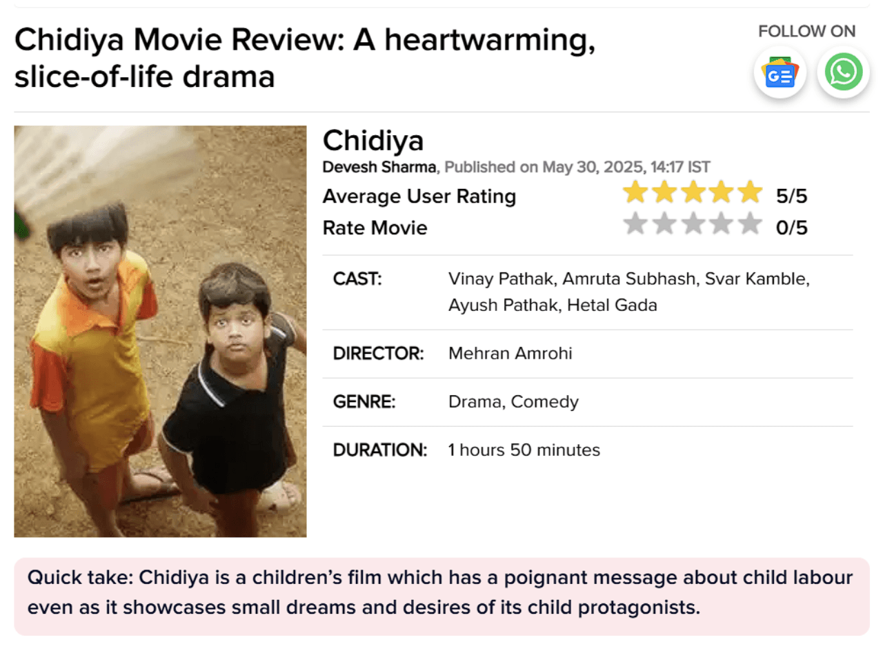 “Chidiya is a must-watch family fare, offering simple yet profound storytelling that warms the heart and leaves you smiling.”