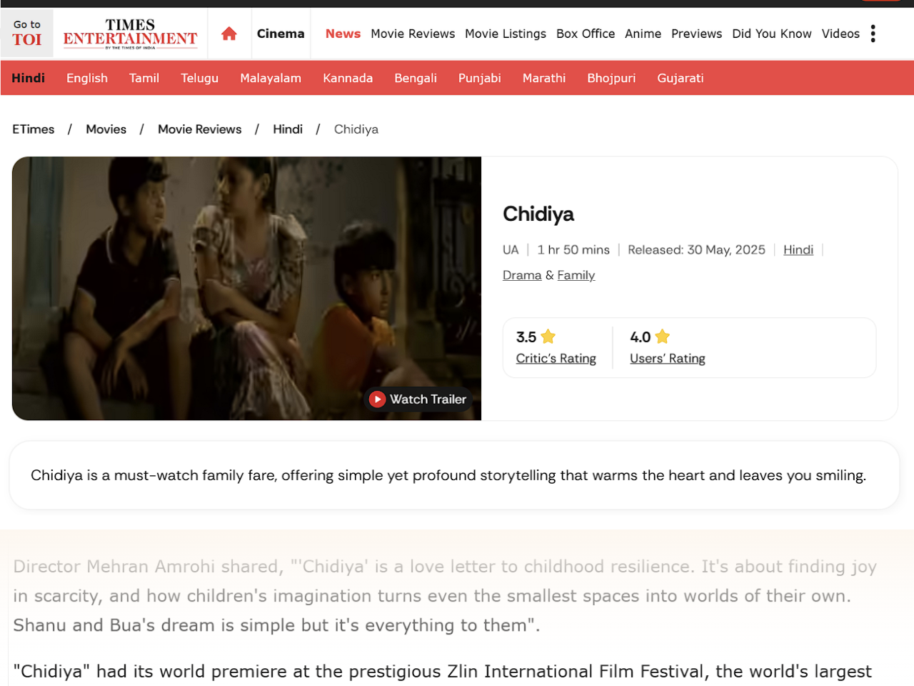 “Chidiya is a must-watch family fare, offering simple yet profound storytelling that warms the heart and leaves you smiling.”